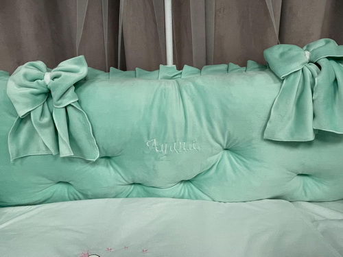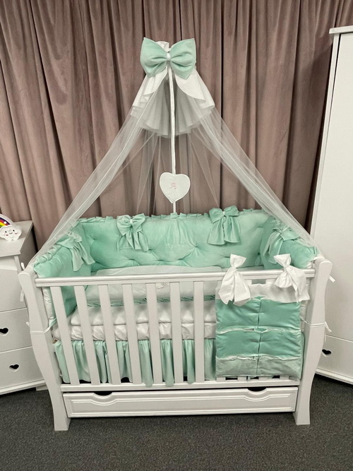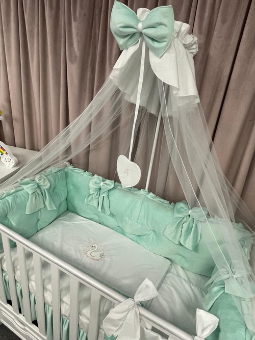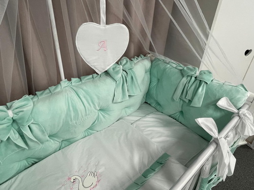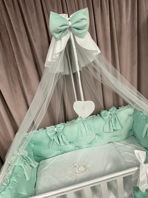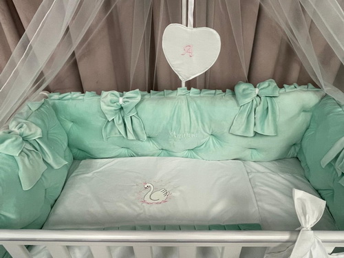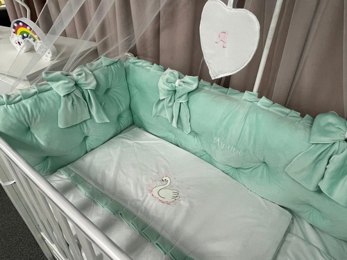 PEPPIbambini ROYAL Mint Velours Literie de bébé 11 pièces linge parure de lit 100% coton avec broderie avec moustiquaire motif brodées