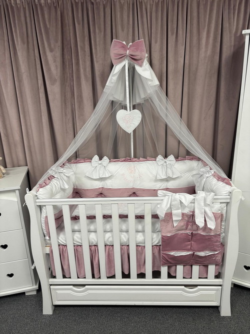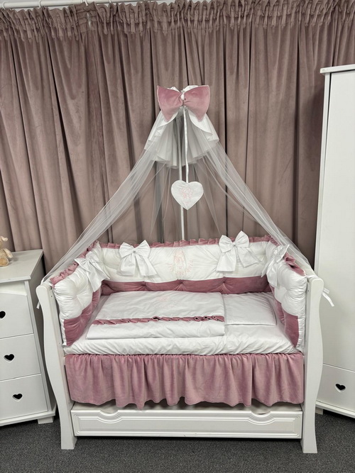 PEPPIbambini ROYAL White Pink Velours Literie de bébé 11 pièces linge parure de lit 100% coton avec broderie avec moustiquaire motif brodées