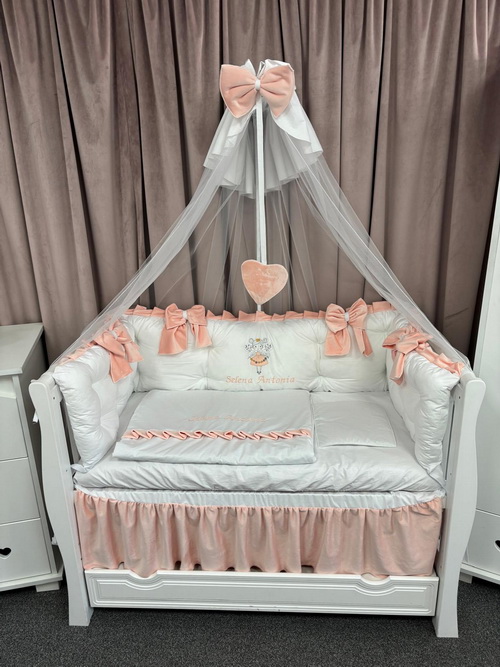 PEPPIbambini ROYAL White Somon Velours Literie de bébé 11 pièces linge parure de lit 100% coton avec broderie avec moustiquaire motif brodées